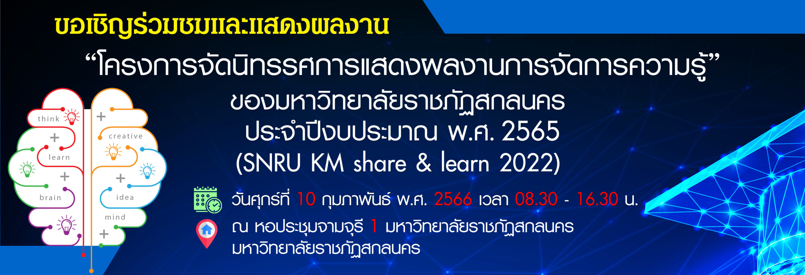 วันศุกร์ที่ 10 กุมภาพันธ์ พ.ศ. 2566 เวลา 08.30 – 17.00 น. มหาวิทยาลัยราชภัฏสกลนคร จัดโครงการนิทรรศการแสดงผลงานการจัดการความรู้ของมหาวิทยาลัยราชภัฏสกลนคร ประจำปีงบประมาณ พ.ศ. 2565 (SNRU KM share & learn 2022) ณ หอประชุมจามจุรี 1 โดย ผศ.ชาคริต ชาญชิตปรีชา รักษาราชการแทนอธิการบดี กล่าวเปิดโครงการ