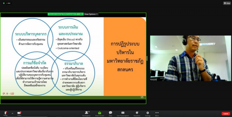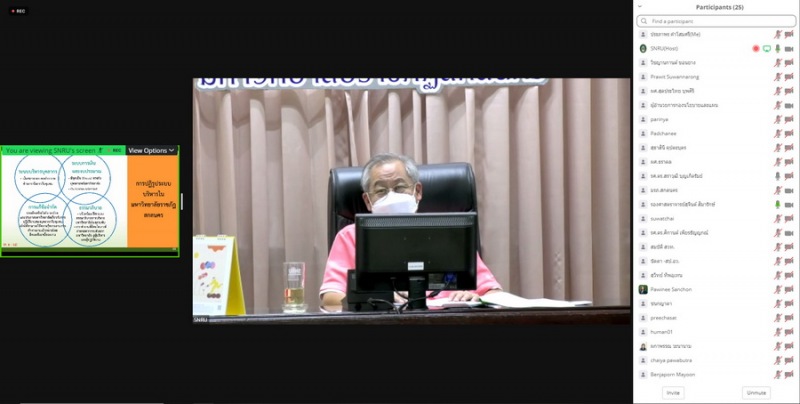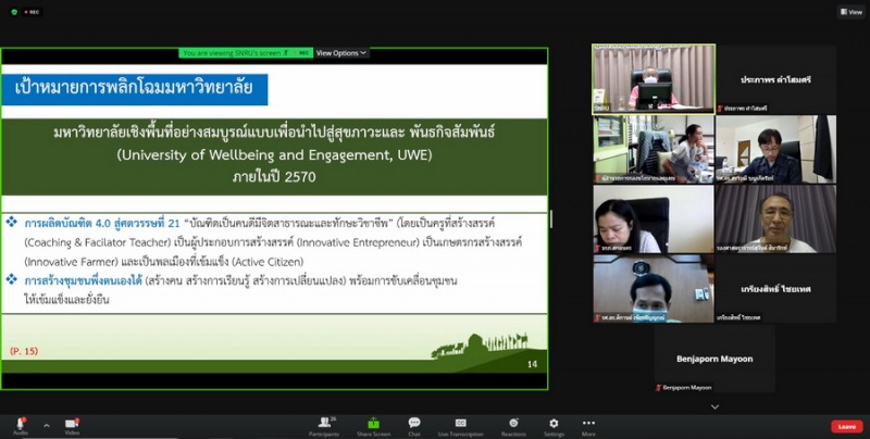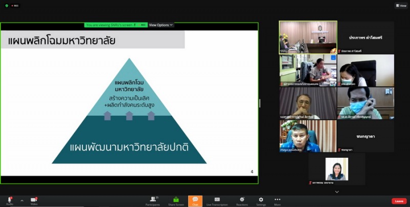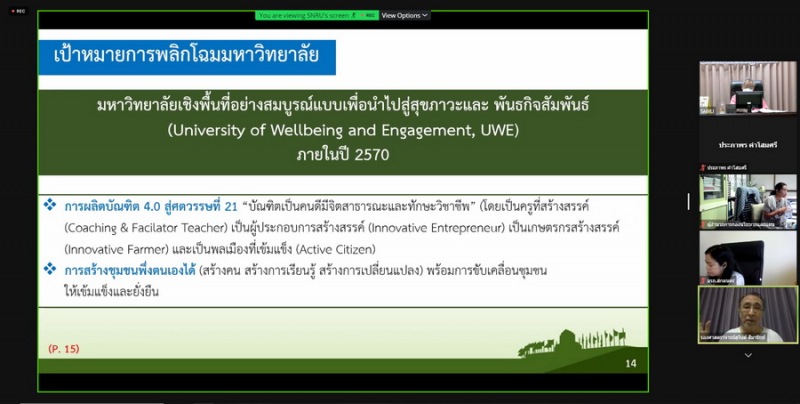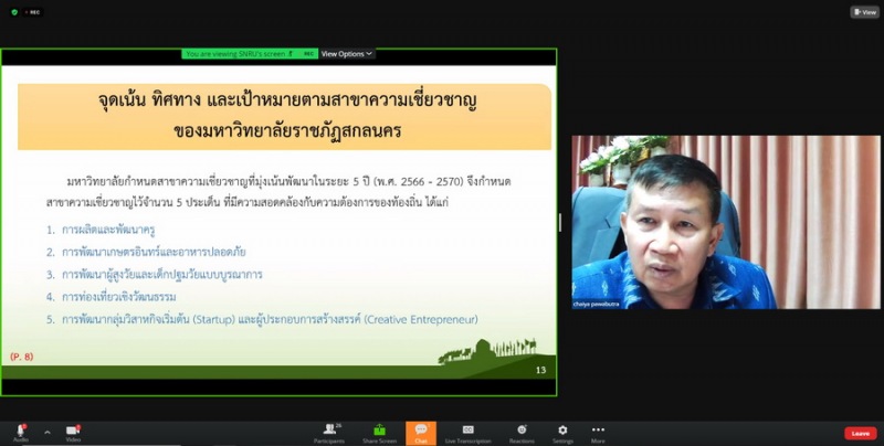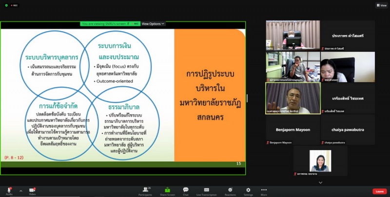 กองนโยบายและแผน จัดประชุมคณะกรรมการประเมินตนเอง และจัดทำแผนพัฒฯาความเป็นเลิศ มหาวิทยาลัยราชภัฏสกลนคร ครั้งที่ 2/2564 ขึ้น ในวันพฤหัสบดีที่ 19 สิงหาคม พ.ศ. 2564 เวลา 08.30 – 12.00 น. ณ ห้องประชุมสรัสจันทร ชั้น 2 อาคาร 10 มหาวิทยาลัยราชภัฏสกลนครโดยได้รับเกียรติจาก รศ.ดร.ชนินทร์ วะสีนนท์ รักษาราชการแทนอธิการบดีมหาวิทยาลัยราชภัฏสกลนคร เป็นประธานกรรมการกล่าวเปิดการประชุมพร้องแจ้งเรื่องที่ประชุมทราบจากนั้นดำเนินการประชุมตามวาระการประชุม โดย ผศ.ดร.กาญจนา วงษ์สวัสดิ์ รองอธิการบดีฝ่ายวางแผนและประกันคุณภาพ นำเสนอ ร่าง แผนพัฒนาความเป็นเลิศ แผนการผลิตกำลังคนระดับสูงเฉพาะทางตามความต้องการของประเทศ ของมหาวิทยาลัยราชภัฏสกลนคร ระยะ 5 ปี (พ.ศ. 2566 – 2570) จากนั้นเป็นข้อเสนอแนะของผู้เข้าประชุม ผ่านสื่ออิเล็กทรอนิกส์ (โปรแกรม Zoom) ด้านการจัดทำแผนพัฒนาความเป็นเลิศ แผนการผลิตกำลังคนระดับสูงเฉพาะทางตามความต้องการของประเทศ ของมหาวิทยาลัยราชภัฏสกลนคร ระยะ 5 ปี (พ.ศ. 2566 – 2570) ร่วมกัน ก่อนนำแผนดังกล่าว เสนอต่อคณะกรรมการบริหารมหาวิทยาลัย ในลำดับต่อไปฯลฯ