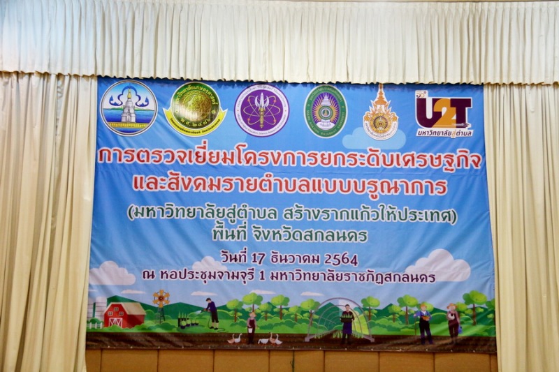 วันที่ 17 ธันวาคม 64 เวลา 09.00 น. ดร.ดนุช ตันเทอดทิตย์ ผู้ช่วยรัฐมนตรีประจำกระทรวงการอุดมศึกษา วิทยาศาสตร์ วิจัยและนวัตกรรม และคณะผู้บริหารฯ ตรวจเยี่ยมโครงการยกระดับเศรษฐกิจและสังคมรายตำบลแบบบูรณาการ (มหาวิทยาลัยสู่ตำบล สร้างรากแก้วให้ประเทศ : U2T) พื้นที่จังหวัดสกลนคร ณ หอประชุมจามจุรี 1 มหาวิทยาลัยราชภัฏสกลนครโดยมี รองผู้ว่าราชการจังหวัดสกลนคร นายพิสิษฐ์ แร่ทอง กล่าวต้อนรับ และ ผศ.ชาคริต ชาญชิตปรีชา รักษาราชการแทนอธิการบดีมหาวิทยาลัยราชภัฏสกลนคร กล่าวรายงานการดำเนินงานในภาพรวมของ 3 มหาวิทยาลัย ได้แก่ ม.ราชภัฏสกลนคร ม.เกษตรศาสตร์ วิทยาเขตเฉลิมพระเกียรติ จ.สกลนคร ม.เทคโนโลยีราชมงคลอีสาน วิทยาเขตสกลนคร จากนั้น ผศ.ดร.สมบูรณ์ ชาวชายโขง รองอธิการบดีฝ่ายวางแผนและประกันคุณภาพ ม.ราชภัฏสกลนคร บรรยายสรุปผลการดำเนินงาน อว. ส่วนหน้า จังหวัดสกลนคร โดยมีผู้บริหาร อาจารย์ บุคลากร และคณะทำงานโครงการ U2T ทั้ง 3 มหาวิทยาลัย ร่วมต้อนรับ และแลกเปลี่ยนความคิดเห็นเกี่ยวกับแนวทางในการดำเนินงานของ อว.ส่วนหน้ากับการพัฒนาจังหวัดสกลนคร พร้อมกันนี้คณะทำงานโครงการ U2T ยังได้จัดนิทรรศการนำเสนอผลงานในครั้งนี้ด้วย