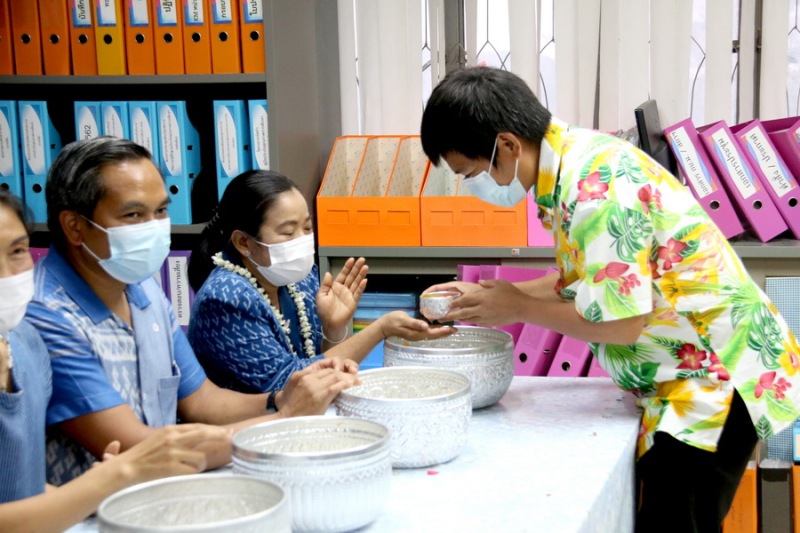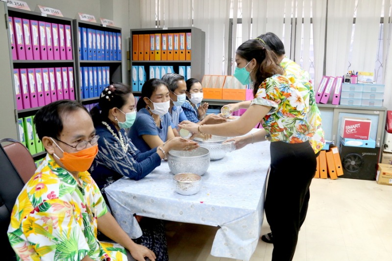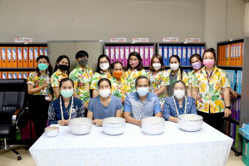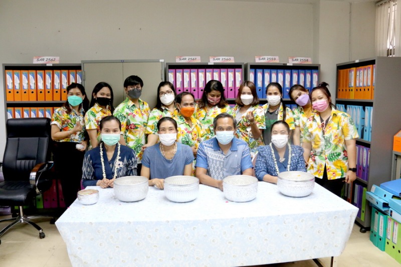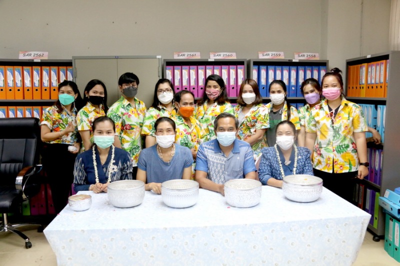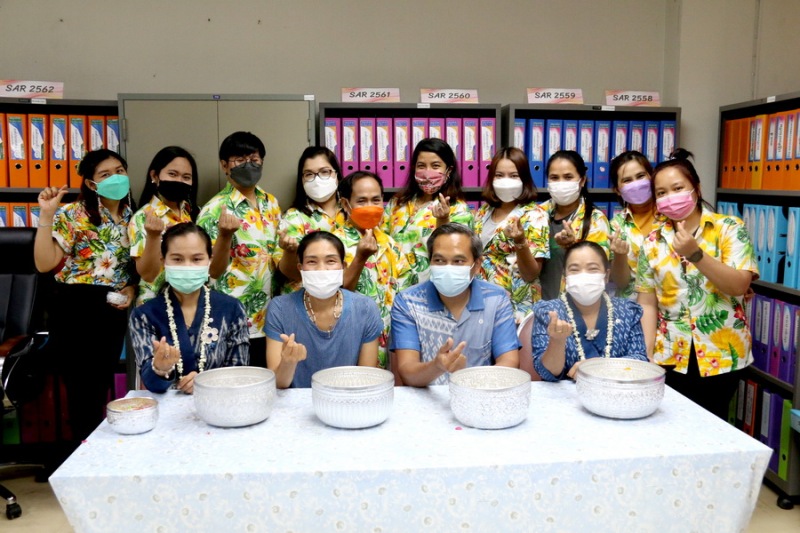 บุคลากรกองนโยบายและแผน ร่วมรดน้ำขอพรจาก ผศ.ดร.สมบูรณ์ ชาวชายโขง รองอธิการบดีฝ่ายวางแผนและประกันคุณภาพ ดร.วินิธา พาณิชย์ ผู้ช่วยอธิการบดีฝ่ายวางแผนและพันธกิจสัมพันธ์ นายเกษม บุตรดี ผู้อำนวยการสำนักงานอธิการบดี และนางอมรรัตน์ ตุ่นกลิ่น รักษาการในตำแหน่งผู้อำนวยการกองนโยบายและ เนื่องในวันสงกรานต์ ประจำปี 2565