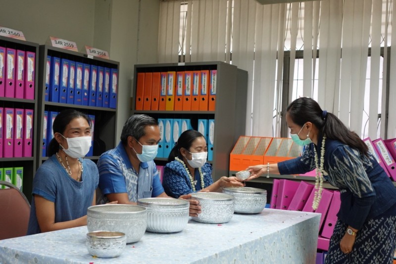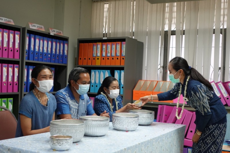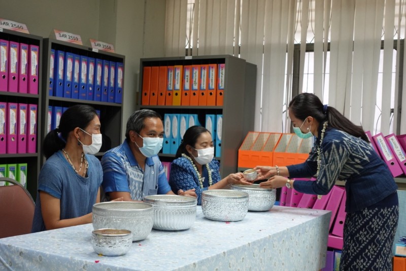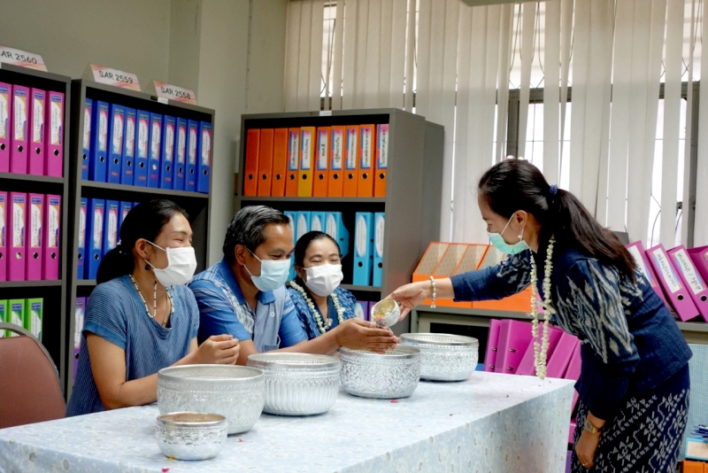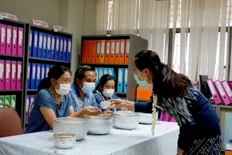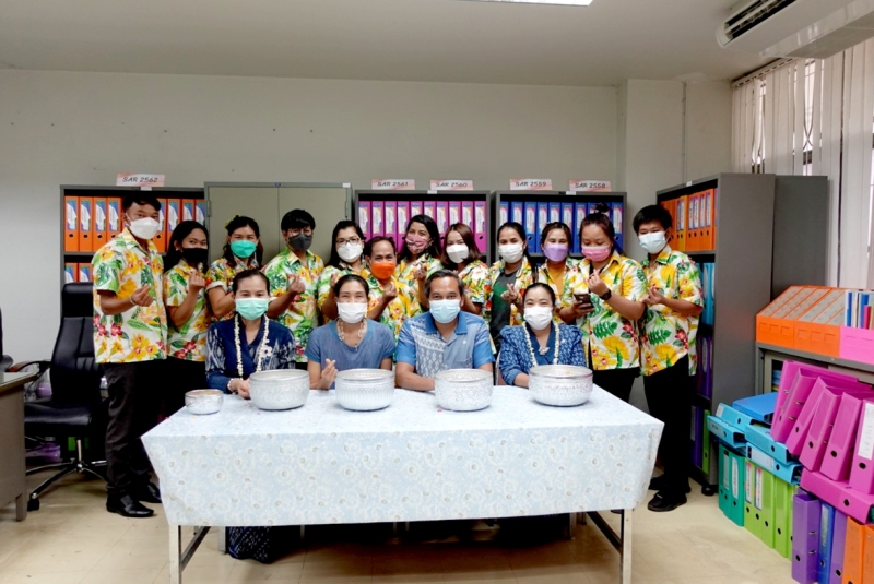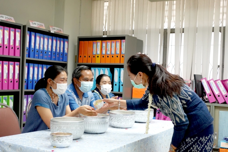 บุคลากรกองนโยบายและแผน ร่วมรดน้ำขอพรจาก ผศ.ดร.สมบูรณ์ ชาวชายโขง รองอธิการบดีฝ่ายวางแผนและประกันคุณภาพ ดร.วินิธา พาณิชย์ ผู้ช่วยอธิการบดีฝ่ายวางแผนและพันธกิจสัมพันธ์ นายเกษม บุตรดี ผู้อำนวยการสำนักงานอธิการบดี และนางอมรรัตน์ ตุ่นกลิ่น รักษาการในตำแหน่งผู้อำนวยการกองนโยบายและ เนื่องในวันสงกรานต์ ประจำปี 2565