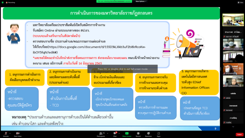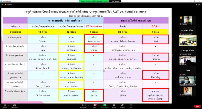วันศุกร์ที่ 10 มิถุนายน พ.ศ. 2565 เวลา 11.00 – 12.00 น. มหาวิทยาลัยราชภัฏสกลนคร โดยกองนโยบายและแผน เชิญผู้บริหาร ประธานตำบล คณาจารย์และบุคลากรที่เกี่ยวข้อง เข้าร่วมประชุมเพื่อหารือและเตรียมความพร้อมดำเนินการโครงการขับเคลื่อนเศรษฐกิจและสังคมฐานรากหลังโควิดด้วยเศรษฐกิจ BCG (U2T for BCG) ผ่านสื่ออิเล็กทรอนิกส์ โปรแกรม Zoom Cloud Meeting ณ ห้องประชุมพุทธชาด ชั้น 3 อาคาร 10 มหาวิทยาลัยราชภัฏสกลนครเพื่อชี้แจงแนวทางการดำเนินการโครงการขับเคลื่อนเศรษฐกิจและสังคมฐานรากหลังโควิดด้วยเศรษฐกิจ BCG (U2T for BCG) และเตรียมการเพื่อกำเนินกิจกรรมดังกล่าวต่อไป