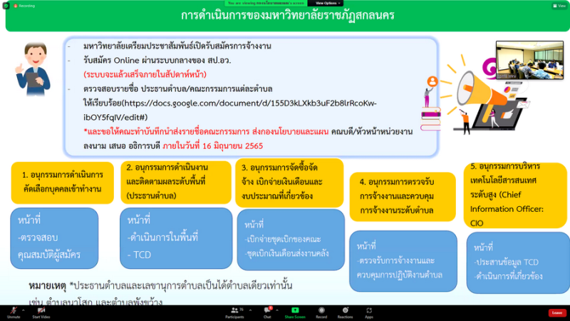 วันศุกร์ที่ 10 มิถุนายน พ.ศ. 2565 เวลา 11.00 – 12.00 น. มหาวิทยาลัยราชภัฏสกลนคร โดยกองนโยบายและแผน เชิญผู้บริหาร ประธานตำบล คณาจารย์และบุคลากรที่เกี่ยวข้อง เข้าร่วมประชุมเพื่อหารือและเตรียมความพร้อมดำเนินการโครงการขับเคลื่อนเศรษฐกิจและสังคมฐานรากหลังโควิดด้วยเศรษฐกิจ BCG (U2T for BCG) ผ่านสื่ออิเล็กทรอนิกส์ โปรแกรม Zoom Cloud Meeting ณ ห้องประชุมพุทธชาด ชั้น 3 อาคาร 10 มหาวิทยาลัยราชภัฏสกลนครเพื่อชี้แจงแนวทางการดำเนินการโครงการขับเคลื่อนเศรษฐกิจและสังคมฐานรากหลังโควิดด้วยเศรษฐกิจ BCG (U2T for BCG) และเตรียมการเพื่อกำเนินกิจกรรมดังกล่าวต่อไป