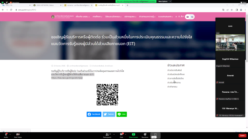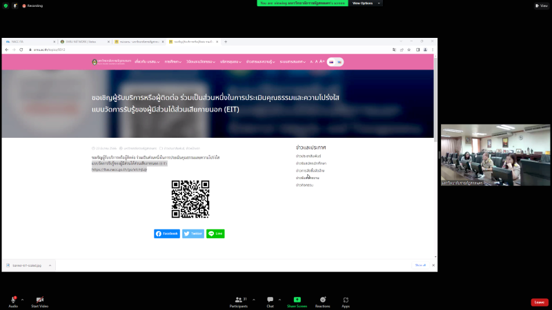 วันจันทร์ที่ 15 พฤษภาคม พ.ศ. 2566 เวลา 10.00 น. กองนโยบายและแผนจัดประชุมชี้แจงการตอบแบบวัดการรับรู้ของผู้มีส่วนได้เสียภายนอก (EIT) ผ่านระบบประชุมทางไกล Zoom Cloud Meetings โดย ศาสตราจารย์ ดร.ทศวรรษ สีตะวัน รองอธิการบดี ด้านวางแผน ยุทธศาสตร์ นวัตกรรม และพันธกิจสากล เป็นประธานเปิดการประชุม จากนั้น นางสาวอรอนงค์ ชูเดชวัฒนา หัวหน้างานยุทธศาสตร์และติดตามประเมินผล ชี้แจงการตอบแบบวัดการรับรู้ของผู้มีส่วนได้เสียภายนอก (EIT) แก่นักศึกษาทุกคณะ ณ ห้องประชุมสรัสจันทร ชั้น 2 อาคาร 10 มหาวิทยาลัยราชภัฏสกลนคร