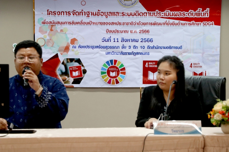 วันศุกร์ที่ 11 สิงหาคม พ.ศ. 2566 เวลา 08.00 – 16.30 น. กองนโยบายและแผน มหาวิทยาลัยราชภัฏสกลนคร บูรณาการร่วมกับ สำนักงานศึกษาธิการจังหวัดสกลนคร จัดประชุมโครงการจัดทำฐานข้อมูลและระบบติดตามประเมินผลระดับพื้นที่เพื่อสนับสนุนการขับเคลื่อนเป้าหมายของสหประชาชาติว่าด้วยการพัฒนาที่ยั่งยืนด้านการศึกษา SDG4 ปีงบประมาณ พ.ศ. 2566