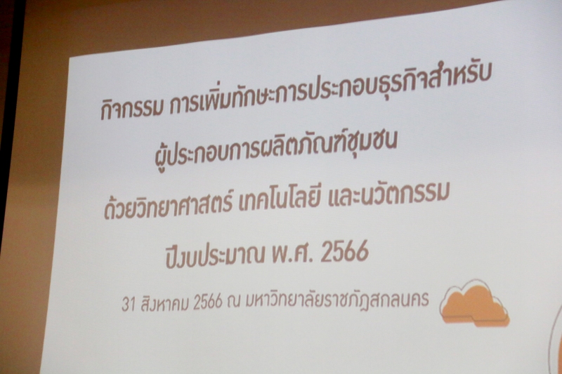 วันพฤหัสบดีที่ 31 สิงหาคม พ.ศ. 2566 เวลา 09.00 น. อว. ส่วนหน้า จังหวัดสกลนคร โดย ผู้ช่วยศาสตราจารย์ชาคริต ชาญชิตปรีชา รักษาราชการแทนอธิการบดีมหาวิทยาลัยราชภัฏสกลนคร กล่าวต้อนรับคณะหน่วยงานจากสำนักงานปลัดกระทรวงการอุดมศึกษา วิทยาศาสตร์ วิจัยและนวัตกรรม ผู้ประกอบการ และผู้เข้าร่วมอบรม กิจกรรม “การเพิ่มทักษะการประกอบธุรกิจสำหรับผู้ประกอบการผลิตภัณฑ์ชุมชน ด้วยวิทยาศาสตร์ เทคโนโลยีและนวัตกรรม” ปีงบประมาณ พ.ศ. 2566