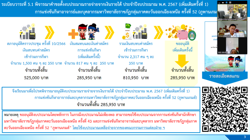 เป็นประธานการประชุม จากนั้นนำเสนอวาระต่อคณะกรรมการบริหารงบประมาณและการเงิน เพื่อพิจารณาอนุมัติงบประมาณรายจ่ายจากเงินรายได้ ประจำปีงบประมาณ พ.ศ. 2567 (เพิ่มเติมครั้งที่ 1) การแข่งขันกีฬาอาจารย์และบุคลากรมหาวิทยาลัยราชภัฏกลุ่มภาคตะวันออกเฉียงเหนือ ครั้งที่ 52 (ภูพานเกมส์) โดย นางอมรรัตน์ ตุ่นกลิ่น รักษาการในตำแหน่งผู้อำนวยการกองนโยบายและแผน