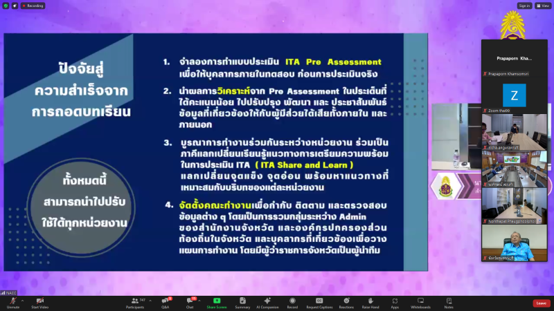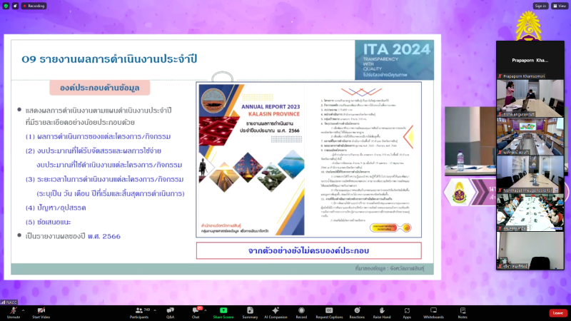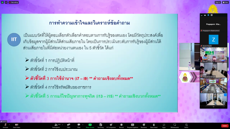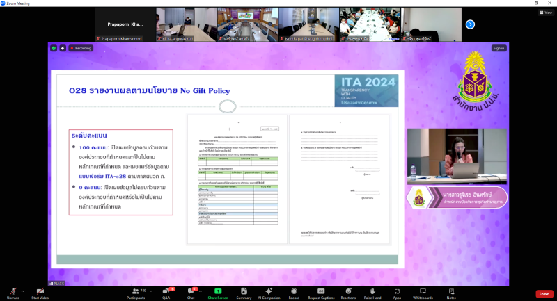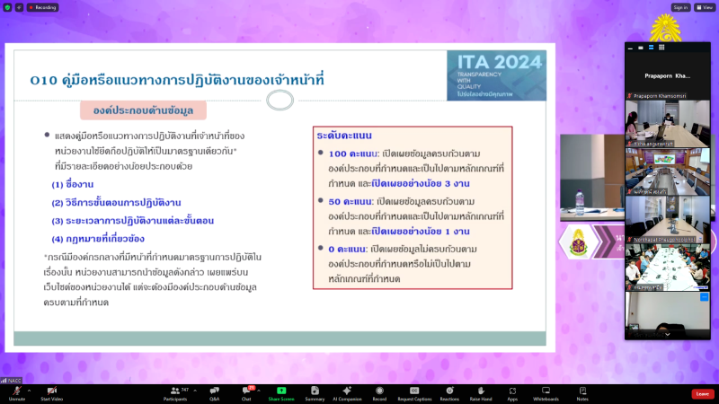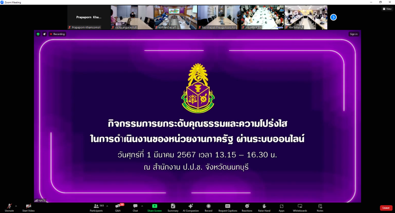 เข้าร่วมกิจกรรมการยกระดับคุณธรรมและความโปร่งใสในการดำเนินงานของหน่วยงานภาครัฐ ตามหนังสือที่ ปช 0013/ว 0004 ลงวันที่ 9 กุมภาพันธ์ 2567 ผ่านสื่ออิเล็กทรอนิกส์ ด้วยโปรแกรม Zoom Cloud Meetings