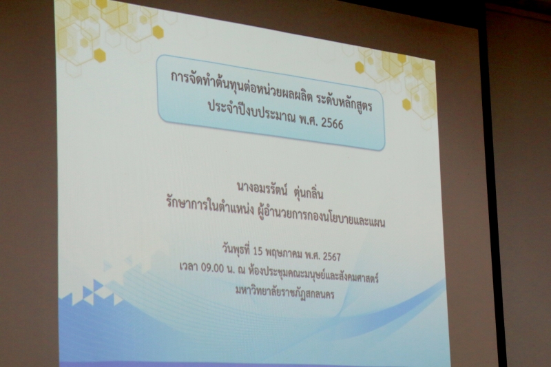 วันพุธที่ 15 พฤษภาคม พ.ศ. 2567 เวลา 09.00 – 12.00 น. กองนโยบายและแผน จัดอบรมเชิงปฏิบัติการ เรื่อง การจัดทำต้นทุนต่อหน่วยผลผลิต ระดับหลักสูตร ประจำปีงบประมาณ พ.ศ. 2566 ให้คณะมนุษยศาสตร์และสังคมศาสตร์ ณ ห้องประชุมคณะมนุษยศาสตร์และสังคมศาสตร์ ชั้น 2 อาคาร 3 มหาวิทยาลัยราชภัฏสกลนคร