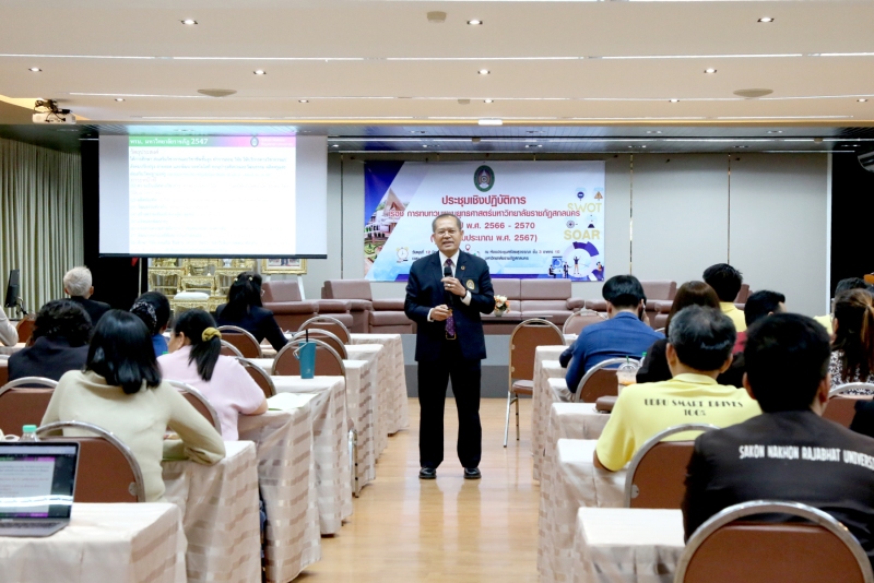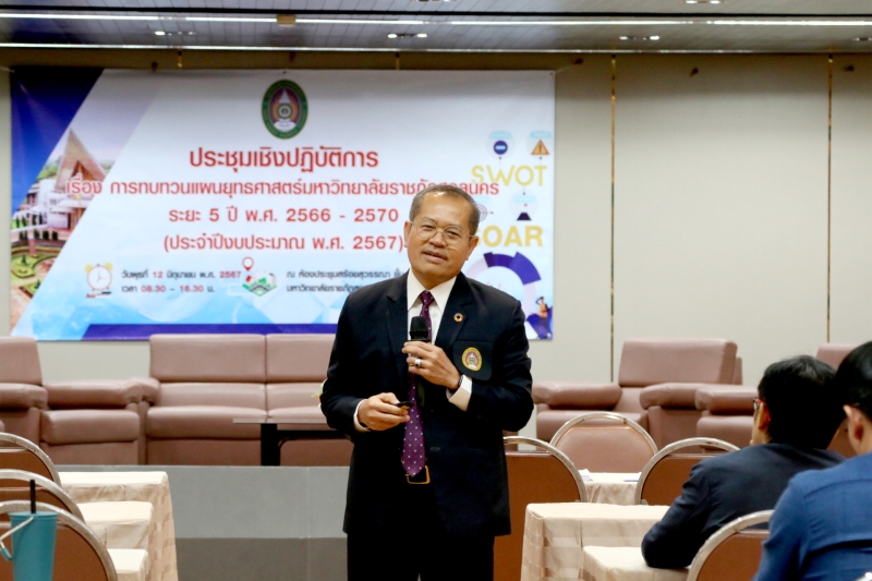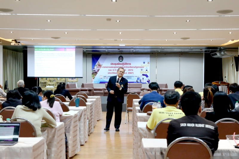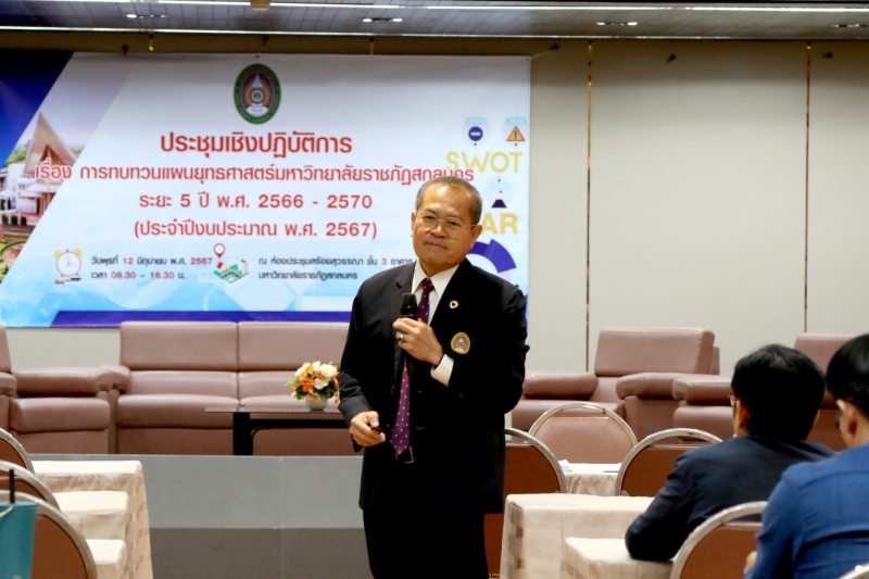 วันพุธที่ 12 มิถุนายน พ.ศ. 2567 เวลา 08.30 – 16.30 น. กองนโยบายและแผน จัดประชุมเชิงปฏิบัติการ เรื่อง การทบทวนแผนยุทธศาสตร์มหาวิทยาลัยราชภัฏสกลนคร ระยะ 5 ปี พ.ศ. 2566 – 2570 (ประจำปีงบประมาณ พ.ศ. 2567) โดย ผู้ช่วยศาสตราจารย์ชาคริต ชาญชิตปรีชา อธิการบดีมหาวิทยาลัยราชภัฏสกลนคร กล่าวต้อนรับแขกผู้มีเกียรติ และผู้เข้าร่วมประชุม รศ.ดร.ไตรรัตน์ โภคพลากรณ์ อุปนายกสภามหาวิทยาลัยราชภัฏสกลนคร เป็นประธานเปิดการประชุมพร้อมมอบนโยบาย “แนวนโยบายสภามหาวิทยาลัย”