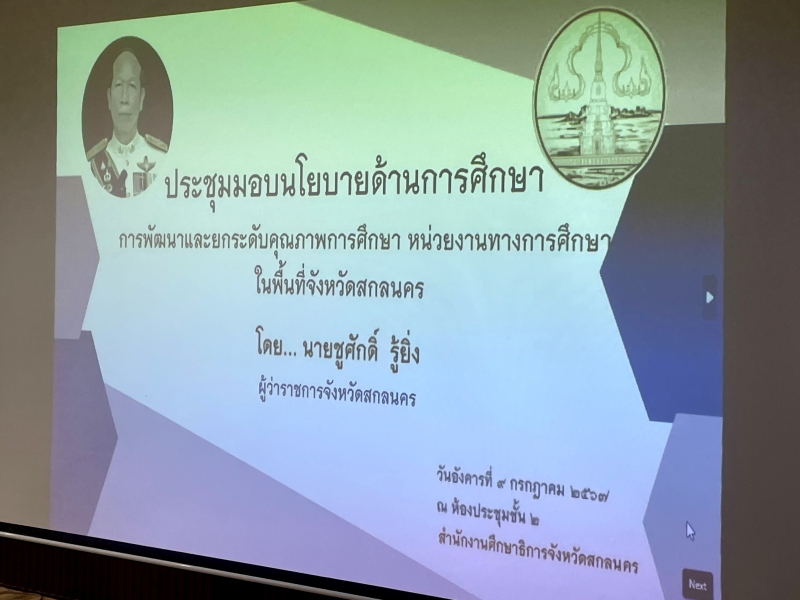 เข้าร่วมประชุมมอบนโยบายด้านการศึกษาการพัฒนาและยกระดับคุณภาพการศึกษา หน่วยงานทางการศึกษาในพื้นที่จังหวัดสกลนคร ณ ห้องประชุมสำนักงานศึกษาธิการจังหวัดสกลนคร ชั้น 2 โดย นายชูศักดิ์ รู้ยิ่ง ผู้ว่าราชการจังหวัดสกลนคร เป็นประธานการประชุม วัตถุประสงค์เพื่อกำหนดแนวทางและนโยบายชับเคลื่อนการศึกษาเพื่อยกระดับคุณภาพการศึกษาของคนทุกช่วงวัยการจัดการศึกษาทุกระดับและทุกประเภทในจังหวัดสกลนคร ให้มีการชับเคลื่อนบูรณาการจัดการศึกษา ทุกภาคส่วนเป็นไปในทิศทางเดียวกัน ฯลฯ