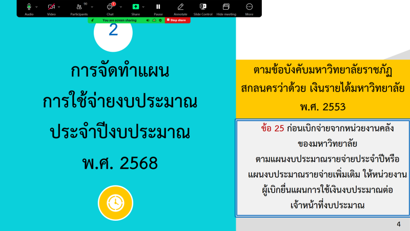 วันศุกร์ที่ 6 กันยายน พ.ศ. 2567 เวลา 14.00 – 16.00 น. กองนโยบายและแผน มหาวิทยาลัยราชภัฏสกลนคร จัดประชุมเชิงปฏิบัติการการจัดทำแผนการใช้จ่ายงบประมาณ ประจำปีงบประมาณ พ.ศ. 2568 ณ ห้องปฏิบัติการคอมพิวเตอร์ ชั้น 2 (1123 – 1124) อาคารศูนย์ภาษาและคอมพิวเตอร์ มหาวิทยาลัยราชภัฏสกลนคร ผ่านสื่ออิเล็กทรอนิกส์ ระบบ Zoom Meeting