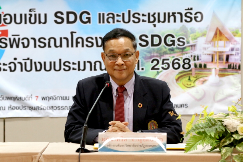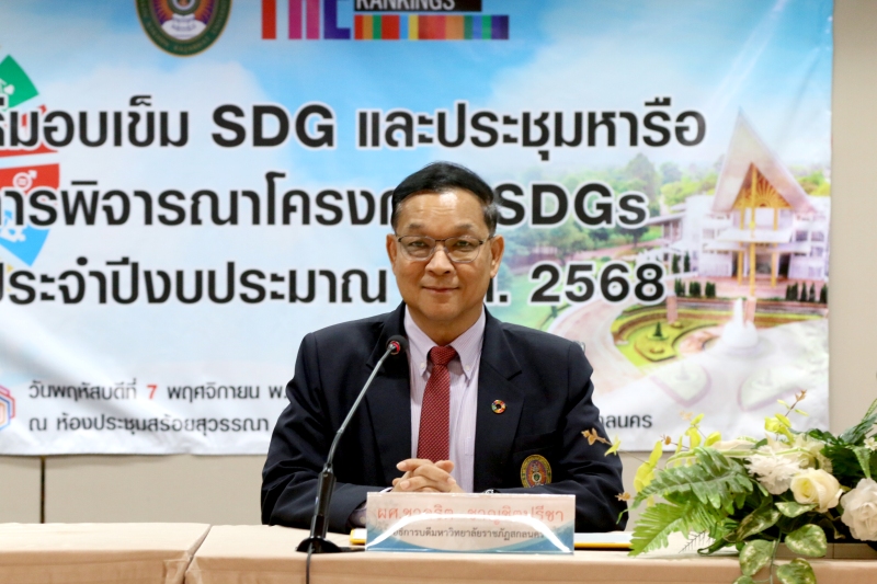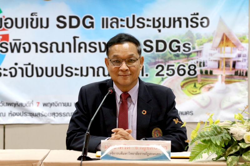 โดยได้รับเกียรติจาก ผู้ช่วยศาสตราจารย์ชาคริต ชาญชิตปรีชา อธิการบดีมหาวิทยาลัยราชภัฏสกลนคร เป็นผู้มอบเข็ม SDG เพื่อแสดงความขอบคุณและเป็นเกียรติแก่ประธาน SDGs และผู้แทน ทั้ง 17 ท่าน รวมทั้งคณะดำเนินการขับเคลื่อนเป้าหมายการพัฒนาที่ยั่งยืน จากนั้นเป็นการหารือการพิจารณา เสนอแนะโครงการ SDGs ประจำปีงบประมาณ พ.ศ. 2568 โดย ศาสตราจารย์ ดร.ทศวรรษ สีตะวัน รองอธิการบดีด้านวางแผน ยุทธศาสตร์ นวัตกรรมและพันธกิจสากล พร้อมด้วย นางอมรรัตน์ ตุ่นกลิ่น รักษาการในตำแหน่งผู้อำนวยการกองนโยบายและแผน