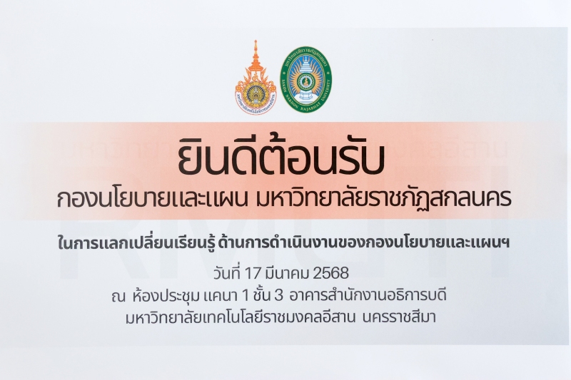 วันที่ 17 มีนาคม 2568 เวลา 10.00 – 16.30 น. กองนโยบายและแผน มหาวิทยาลัยราชภัฏสกลนคร โดย ศาสตราจารย์ ดร.ทศวรรษ สีตะวัน รองอธิการบดี พร้อมด้วยนางอมรรัตน์ ตุ่นกลิ่น รักษาการในตำแหน่งผู้อำนวยการกองนโยบายและแผน และบุคลากรกองนโยบายและแผน เข้าศึกษาดูมหาวิทยาลัยเทคโนโลยีราชมงคลอีสาน ด้านการดำเนินงานของกองนโยบายและเเผน และระบบการประเมินผลการปฏิบัติราชการของบุคลากร ณ ห้องประชุมแคนา 1 ชั้น 3 อาคารสำนักงานอธิการบดี มหาวิทยาลัยเทคโนโลยีราชมงคลอีสาน