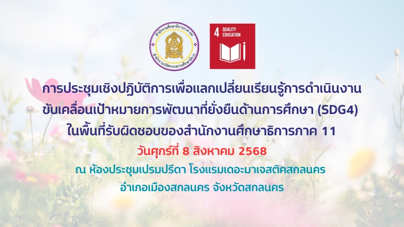 ประชุมเชิงปฏิบัติการเพื่อแลกเปลี่ยนเรียนรู้การดำเนินงานขับเคลื่อนเป้าหมายการพัฒนาที่ยั่งยืนด้านการศึกษา (SDG4) ในพื้นที่รับผิดชอบของสำนักงานศึกษาธิการภาค 11 (8 สิงหาคม 2568)