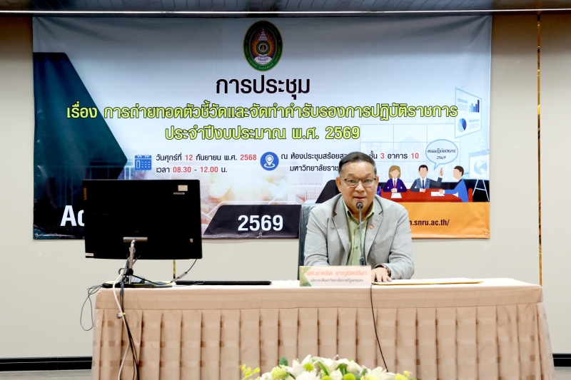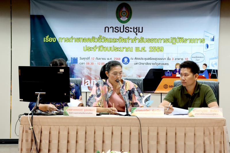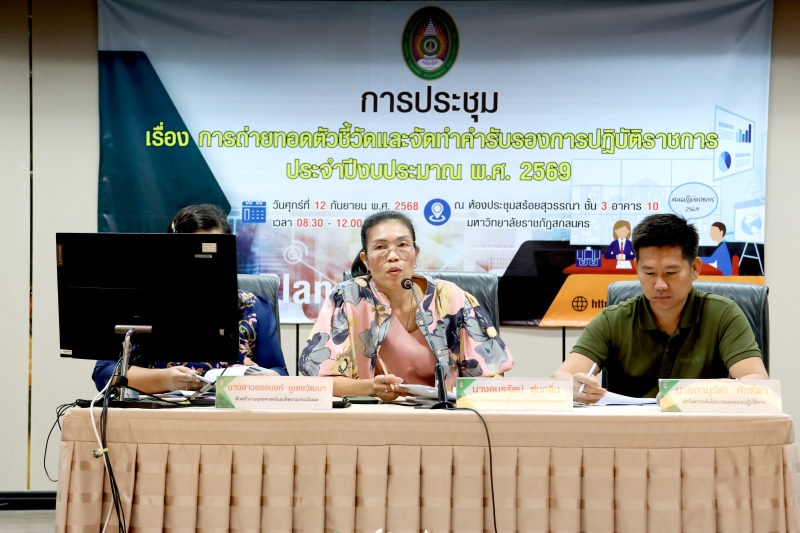 วันศุกร์ที่ 12 กันยายน พ.ศ. 2568 เวลา 08.30 – 12.00 น. กองนโยบายและแผนจัดประชุม เรื่อง การถ่ายทอดตัวชี้วัดและจัดทำคำรับรองการปฏิบัติราชการ ประจำปีงบประมาณ พ.ศ. 2569 ณ ห้องประชุมสร้อยสุวรรณา ชั้น 3 อาคาร 10 มหาวิทยาลัยราชภัฏสกลนคร