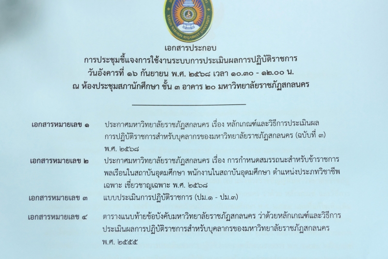 วันอังคารที่ 16 กันยายน พ.ศ. 2568 เวลา 10.30 – 12.00 น. สำนักงานอธิการบดี การประชุมชี้แจงการใช้งานระบบการประเมินผลการปฏิบัติราชการของบุคลากรสายสนับสนุนวิชาการ ณ ห้องประชุมสภานักศึกษา ชั้น 3 อาคาร 20 มหาวิทยาลัยราชภัฏสกลนคร และประชุมออนไลน์ผ่านโปรแกรม Google Meet
