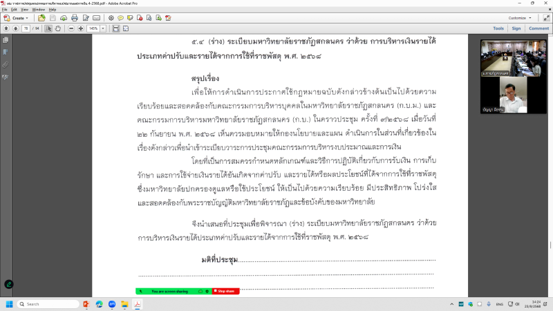 โดย ผู้ช่วยศาสตราจารย์ชาคริต ชาญชิตปรีชา อธิการบดีมหาวิทยาลัยราชภัฏสกลนคร เป็นประธานการประชุม พร้อมแจ้งวาระเพื่อทราบ โดยมี วาระเรื่องเสนอเพื่อทราบ จำนวน 1 วาระ วาระเรื่องเสนอเพื่อพิจารณา จำนวน 6 วาระ นำเสนอโดย นางอมรรัตน์ ตุ่นกลิ่น รักษาการในตำแหน่งผู้อำนวยการกองนโยบายและแผน