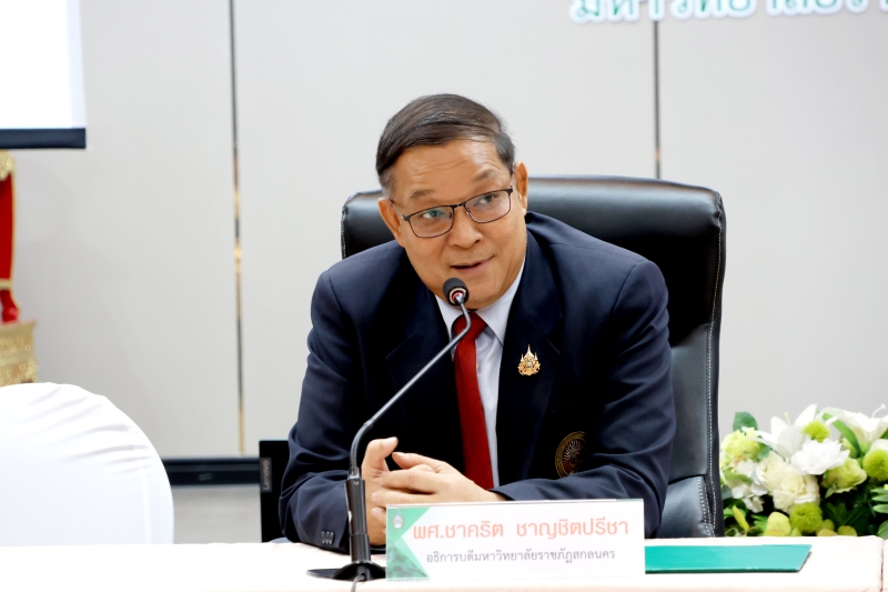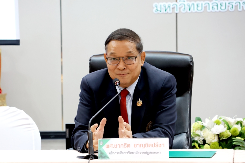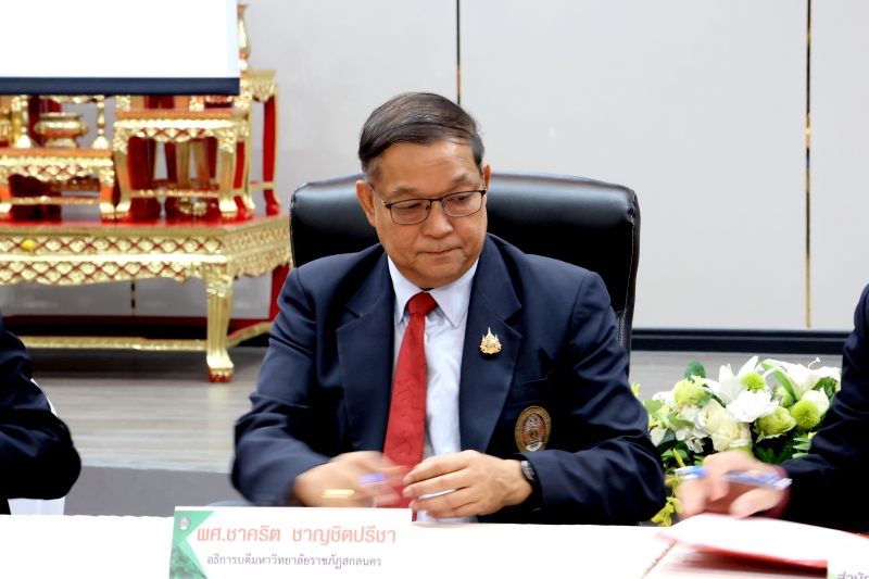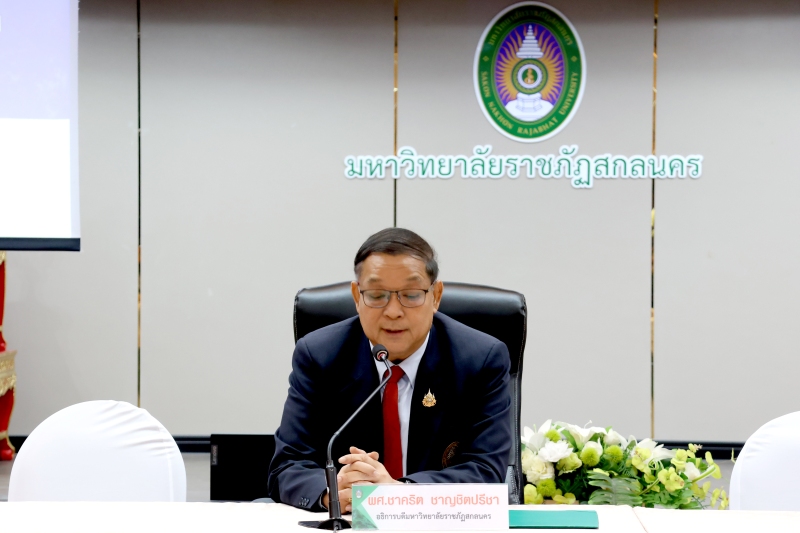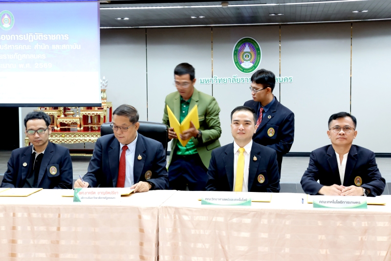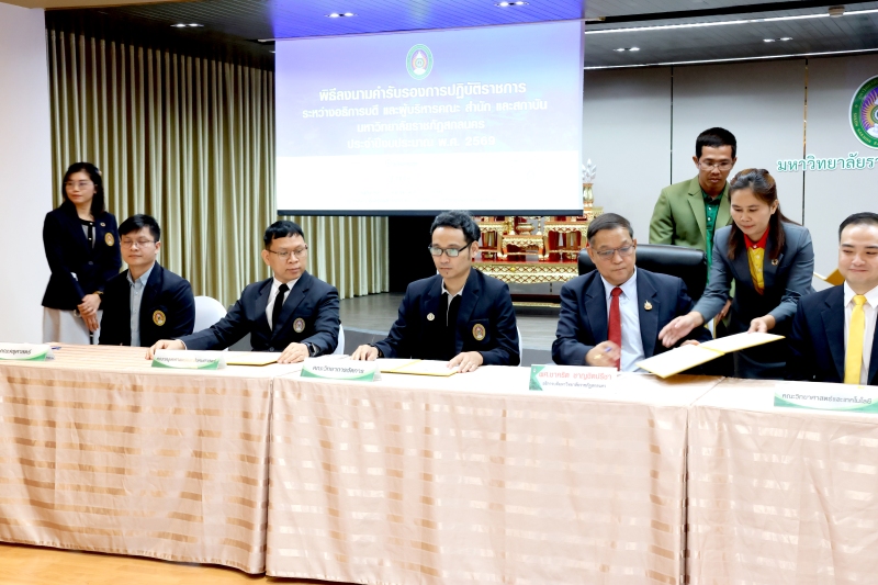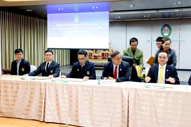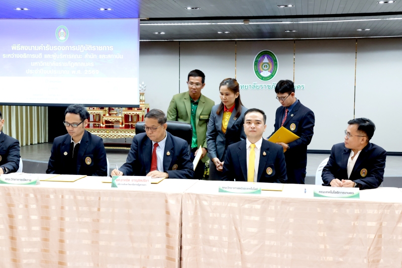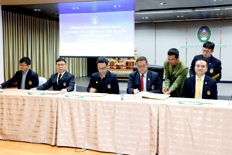 โดยมี ผู้ช่วยศาสตราจารย์ชาคริต ชาญชิตปรีชา อธิการบดี เป็นประธานในพิธีลงนามและชี้แจงนโยบายการดำเนินงานแผนปฏิบัติราชการ และ ศาสตราจารย์ ดร.ทศวรรษ สีตะวัน รองอธิการบดี กล่าวรายงาน พร้อมด้วยผู้บริหาร และบุคลากร ร่วมเป็นสักขีพยานในการลงนามครั้งนี้ ณ ห้องประชุมสร้อยสุวรรณา ชั้น 3 อาคาร 10 มหาวิทยาลัยราชภัฏสกลนคร ในการนี้ ผู้บริหาร ทั้ง 12 หน่วยงาน ประกอบด้วย คณะครุศาสตร์ คณะมนุษยศาสตร์และสังคมศาสตร์ คณะวิทยาการจัดการ คณะวิทยาศาสตร์และเทคโนโลยี คณะเทคโนโลยีการเกษตร คณะเทคโนโลยีอุตสาหกรรม บัณฑิตวิทยาลัย สำนักงานอธิการบดี สำนักส่งเสริมวิชาการและงานทะเบียน สำนักวิทยบริการและเทคโนโลยีสารสนเทศ สถาบันภาษา ศิลปะและวัฒนธรรม และ สถาบันวิจัยและพัฒนา ร่วมลงนามคำรับรองปฏิบัติราชการระหว่างผู้บริหารทุกส่วนราชการภายในมหาวิทยาลัย กับอธิการบดีเพื่อขับเคลื่อนนโยบายของมหาวิทยาลัยสู่การปฏิบัติ และเป็นหลักประกันการปฏิบัติงานตามแผนปฏิบัติราชการของหน่วยงานภายในมหาวิทยาลัย ประจำปีงบประมาณ พ.ศ. 2569 ให้บรรลุเป้าหมาย และเกิดประโยชน์ในการบริหารจัดการภายในหน่วยงานและสนับสนุนการดำเนินงานของมหาวิทยาลัย