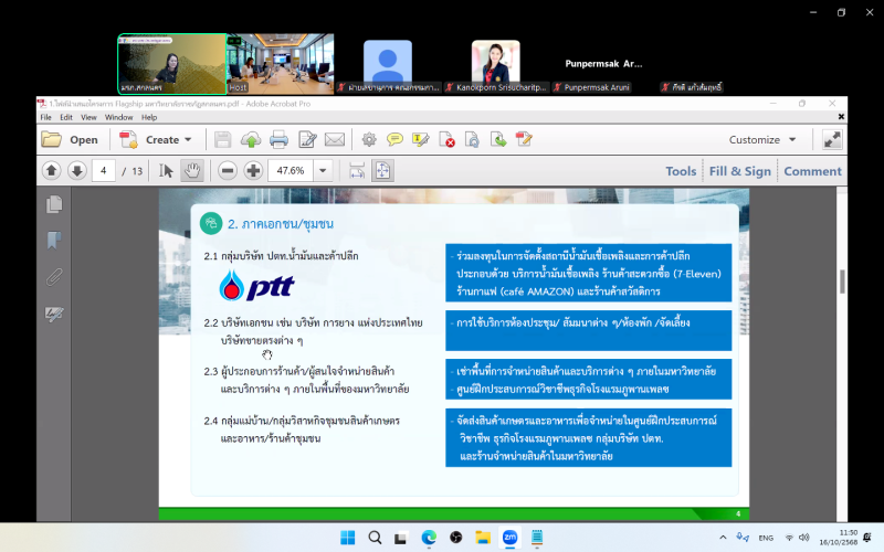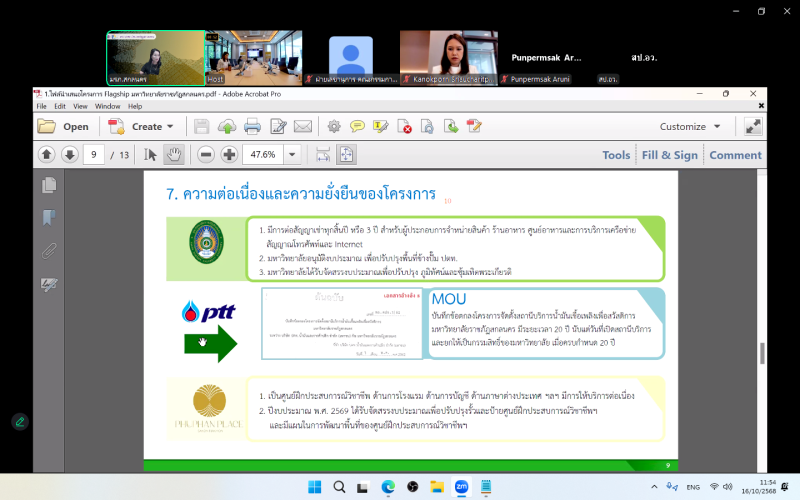นำเสนอโครงการจัดหารายได้จากการใช้ประโยชน์จากพื้นที่ของมหาวิทยาลัย ในการประชุมคัดเลือกโครงการเพื่อเป็นต้นแบบเรือธงทั้ง 5 วิธีการ (5 Track Flagship) โครงการพัฒนาระบบบริหารการเงินและแนวทางการเพิ่มรายได้ “กลุ่มพัฒนาชุมชนท้องถิ่นหรือชุมชนอื่น” ปีที่ 2 ผ่านสื่ออิเล็กทรอนิกส์ ระบบ Zoom Meeting ณ ห้องประชุมกองนโยบายและแผน ชั้น 4 อาคาร 10 มหาวิทยาลัยราชภัฏสกลนคร ต่อคณะกรรมการพิจารณาสรุปผลการคัดเลือกโครงการเพื่อเป็นต้นแบบเรือธงทั้ง 5 วิธีการ (5 Track Flagship) จัดโดย กองขับเคลื่อนและพัฒนาการอุดมศึกษา วิทยาศาสตร์ วิจัยและนวัตกรรม สำนักงานปลัดกระทรวงการอุดมศึกษา วิทยาศาสตร์ วิจัยและนวัตกรรม