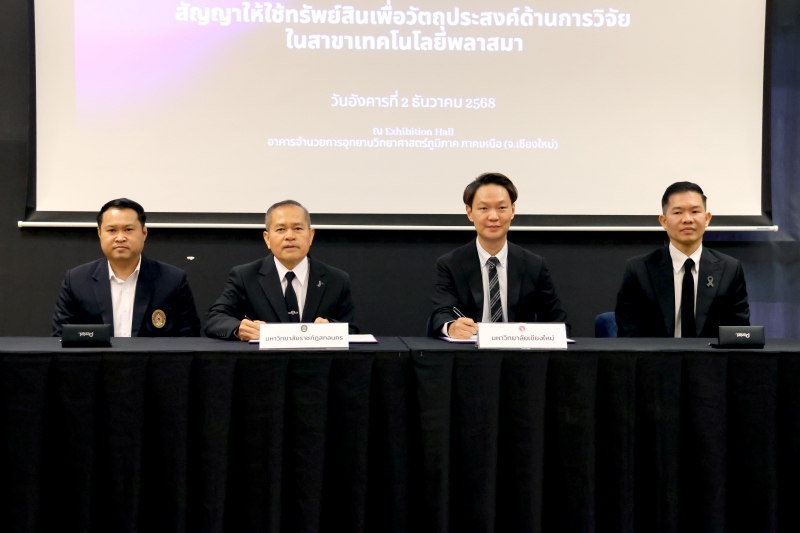 วันที่ 2 ธันวาคม 2568 อุทยานวิทยาศาสตร์และเทคโนโลยี มหาวิทยาลัยเชียงใหม่ (STeP) จัดพิธีลงนามสัญญาให้ใช้ทรัพย์สินเพื่อวัตถุประสงค์ด้านการวิจัยในสาขาเทคโนโลยีพลาสมา (Research Collaboration and Equipment Use Agreement in Plasma Technology) ภายใต้บันทึกข้อตกลงความร่วมมือทางวิชาการระหว่างมหาวิทยาลัยเชียงใหม่ และมหาวิทยาลัยราชภัฏสกลนคร โดยมี รศ.ดร.ปิติวัฒน์ วัฒนชัย ผู้อำนวยการอุทยานฯ และ ศาสตราจารย์ ดร.ทศวรรษ สีตะวัน รองอธิการบดีด้านวางแผน ยุทธศาสตร์ นวัตกรรมและพันธกิจสากล มหาวิทยาลัยราชภัฏสกลนคร ร่วมลงนาม ณ Exhibition Hall อาคารอำนวยการอุทยานวิทยาศาสตร์ภูมิภาค ภาคเหนือ (จังหวัดเชียงใหม่)