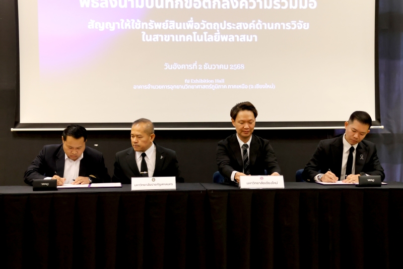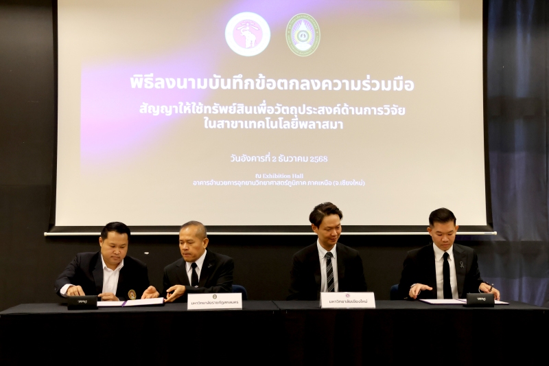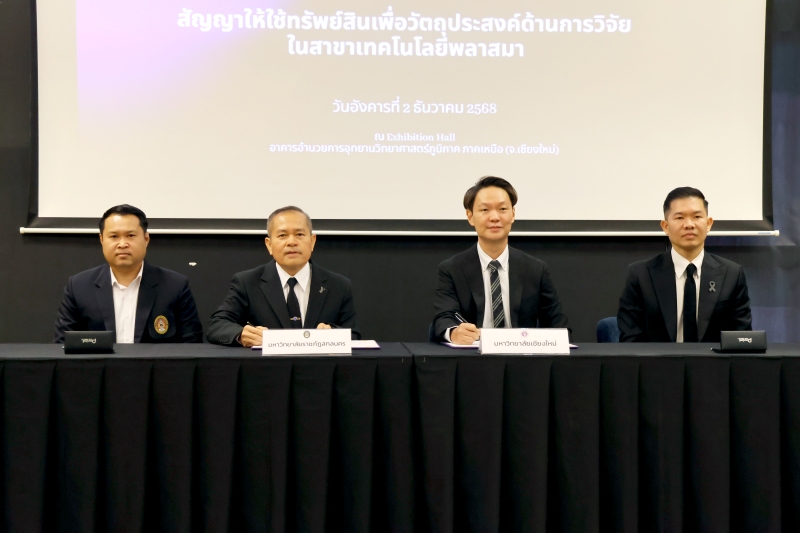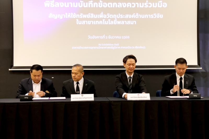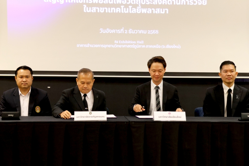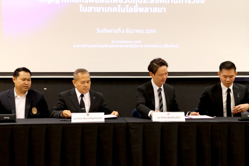 ในงานเดียวกัน ยังมีพิธีลงนาม บันทึกข้อตกลงความร่วมมือทางวิชาการ (MOU) ระหว่างมหาวิทยาลัย โดยมีผู้แทน ผศ.ดร.ชนม์เจริญ แสวงรัตน์ ผู้ช่วยอธิการบดี มหาวิทยาลัยเชียงใหม่ และ ผู้ช่วยศาสตราจารย์ชาคริต ชาญชิตปรีชา อธิการบดีมหาวิทยาลัยราชภัฏสกลนคร ร่วมลงนาม พร้อมรับฟังการบรรยายแนะนำ ศูนย์วิจัยเชิงธุรกิจด้านเทคโนโลยีพลาสมาสำหรับเกษตรและชีวภาพ (Agriculture and Bio Plasma Technology Center: ABPlas) ซึ่งเป็นกลไกสำคัญในการผลักดันงานวิจัยสู่การใช้ประโยชน์ในภาคเกษตร ชีวภาพ และอุตสาหกรรมที่เกี่ยวข้อง