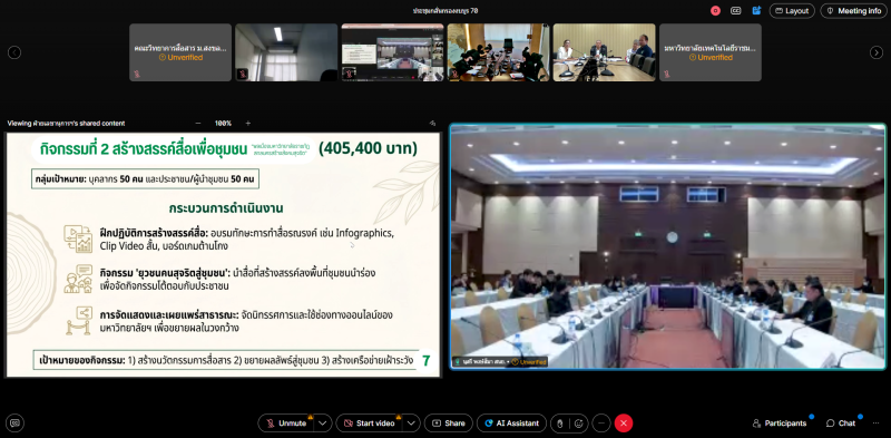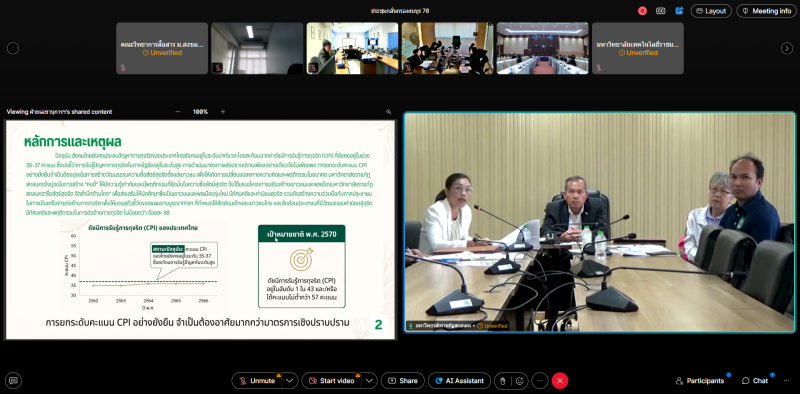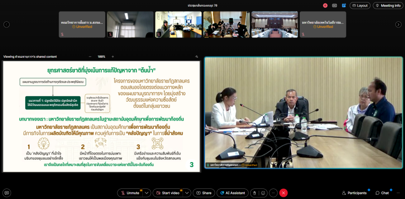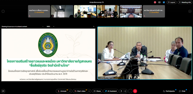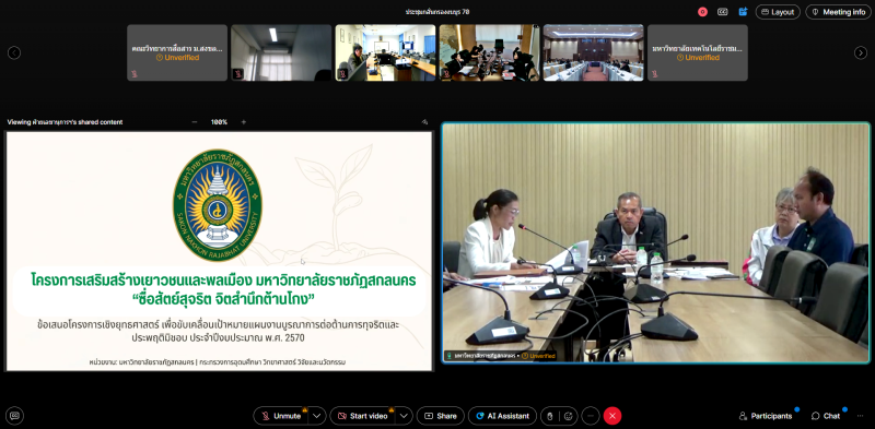 เข้าร่วมการประชุมพิจารณากลั่นกรองโครงการ/กิจกรรม และงบประมาณรายจ่ายบูรณาการประจำปีงบประมาณ พ.ศ. 2570 แผนงานบูรณาการต่อต้านการทุจริตและประพฤติมิชอบ ผ่านสื่ออิเล็กทรอนิกส์ (ระบบ WebEx Meeting) ณ ห้องประชุมกองนโยบายและแผน ชั้น 4 อาคาร 10 มหาวิทยาลัยราชภัฏสกลนคร ในการนี้ มหาวิทยาลัยราชภัฏสกลนครได้ร่วมนำเสนอโครงการเสริมสร้างเยาวชนและพลเมือง มหาวิทยาลัยราชภัฏสกลนคร “ซื่อสัตย์สุจริต จิตสำนึกต้านโกง” ต่อ สานักนโยบายและยุทธศาสตร์ สานักงาน ป.ป.ช. โดย นางอมรรัตน์ ตุ่นกลิ่น รักษาการในตำแหน่งผู้อำนวยการกองนโยบายและแผน