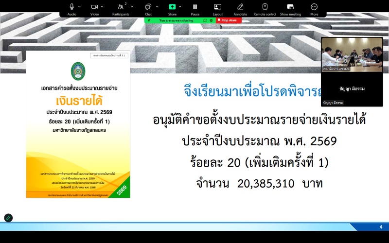 วันจันทร์ที่ 22 ธันวาคม พ.ศ. 2568 เวลา 14.00 น. กองนโยบายและแผน จัดประชุมคณะกรรมการบริหารงบประมาณและการเงิน ครั้งที่ 5/2568 ผ่านสื่ออิเล็กทรอนิกส์ ระบบ Zoom Meeting ณ ห้องประชุมสุพรรณิการ์ ชั้น 4 อาคาร 10 มหาวิทยาลัยราชภัฏสกลนคร