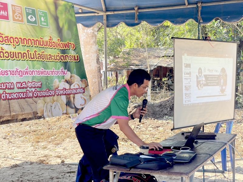 ภายใต้โครงการวิทยาลัยราชภัฏเพื่อการพัฒนาท้องถิ่น ประจำปีงบประมาณ พ.ศ. 2569 ณ ฟารมเห็ดเท่ห์เห็ดฟาง บ้านดงมะไฟ ตำบลดงมะไฟ อำเภอเมือง จังหวัดสกลนคร โดยมีวัตถุประสงค์เพื่อถ่ายทอดองค์ความรู้และเสริมสร้างทักษะให้แก่แก่เกษตรกรในชุมชนบ้านดงมะไฟ เกี่ยวกับการผลิตดินปลูกคุณภาพจากวัสดุเหลือทิ้งประเภทกากมันเชื้อเห็ดฟาง ซึ่งเป็นแนวทางหนึ่งในการจัดการทรัพยากรอย่างมีประสิทธิภาพและยั่งยืน ควบคู่กับการส่งเสริมการนำเทคโนโลยีและนวัตกรรมที่เหมาะสมมาประยุกต์ใช้ในการพัฒนาและแปรรูปดินปลูกอัดเม็ดจากกากมันเชื้อเห็ดฟาง อันเป็นการเพิ่มประสิทธิภาพในกระบวนการผลิตและยกระดับมูลค่าเชิงพาณิชย์ของผลิตภัณฑ์ นอกจากนี้ ยังมุ่งพัฒนาทักษะด้านการออกแบบตราสินค้าและบรรจุภัณฑ์ให้แก่เกษตรกรและชุมชนเพื่อเสริมสร้างภาพลักษณ์ของผลิตภัณฑ์ดินปลูกอัดเม็ด และเตรียมความพร้อมในการเข้าสู่ตลาด ทั้งในระดับท้องถิ่นและระดับภูมิภาคต่อไป