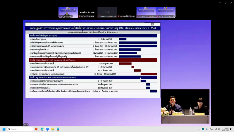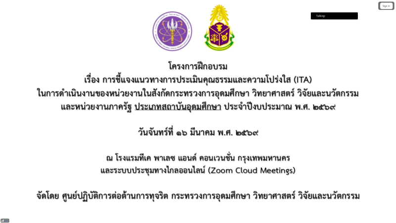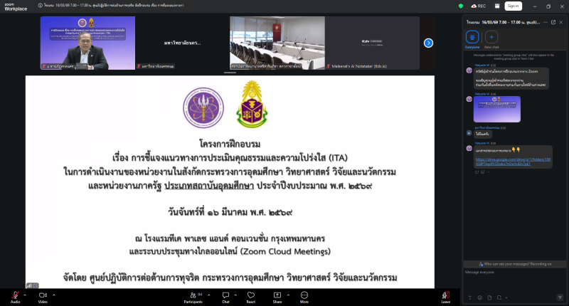 อบรม เรื่อง การชี้แจงหลักเกณฑ์การประเมินคุณธรรมและความโปร่งใส (ITA) ในการดำเนินงานของหน่วยงานในสังกัดกระทรวงการอุดมศึกษา วิทยาศาสตร์ วิจัยและนวัตกรรม (กระทรวง อว.) และหน่วยงานภาครัฐ ประเภทสถาบันอุดมศึกษา ประจำปีงบประมาณ พ.ศ. 2569 (16 มีนาคม 2569)