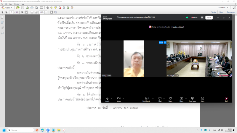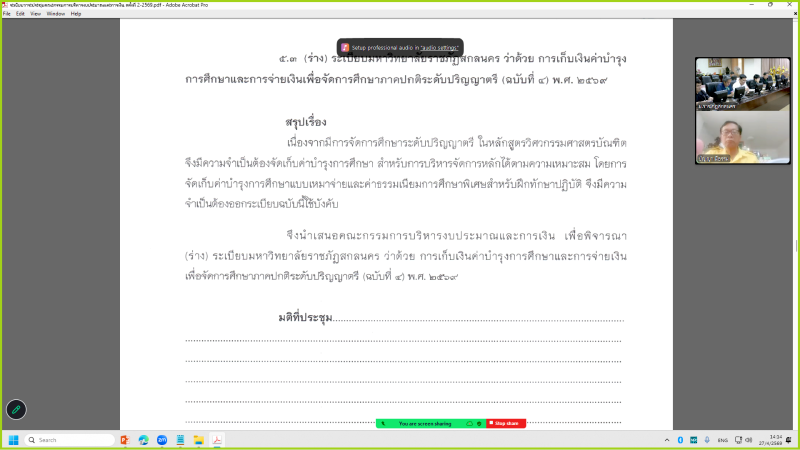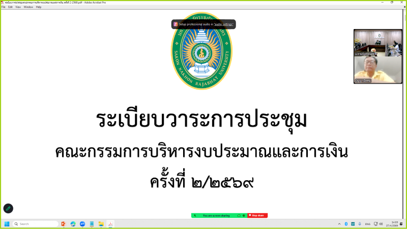 วันจันทร์ที่ 27 เมษายน พ.ศ. 2569 เวลา 14.00 น. ผู้ช่วยศาสตราจารย์ชาคริต ชาญชิตปรีชา อธิการบดี เป็นประธานการประชุมคณะกรรมการบริหารงบประมาณและการเงิน ครั้งที่ 2/2569 ผ่านระบบประชุมทางไกลออนไลน์ (Zoom Cloud Meetings) ณ ห้องประชุมสรัสจันทร ชั้น 2 อาคาร 10 มหาวิทยาลัยราชภัฏสกลนคร โดยมี วาระเรื่องเสนอเพื่อทราบ จำนวน 1 วาระ วาระเรื่องเสนอเพื่อพิจารณา จำนวน 7 วาระ